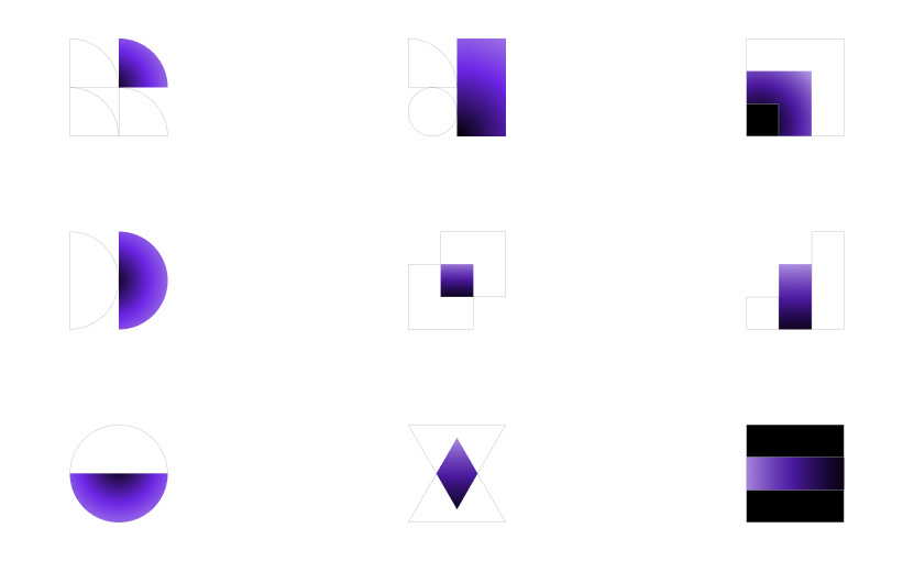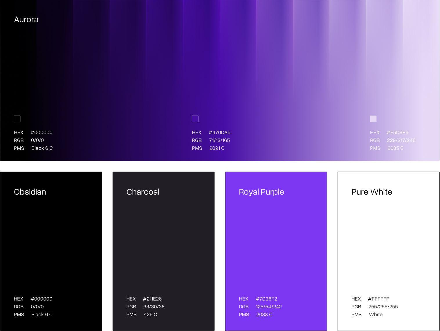 Our color palette embraces a sophisticated aesthetic with dark backgrounds and strategic accent colors, reflecting our modern identity and premium feel. The vibrant Royal Purple, anchored by our Aurora gradient, is our main color. This choice symbolizes innovation, vision, and our premium, elitist positioning.